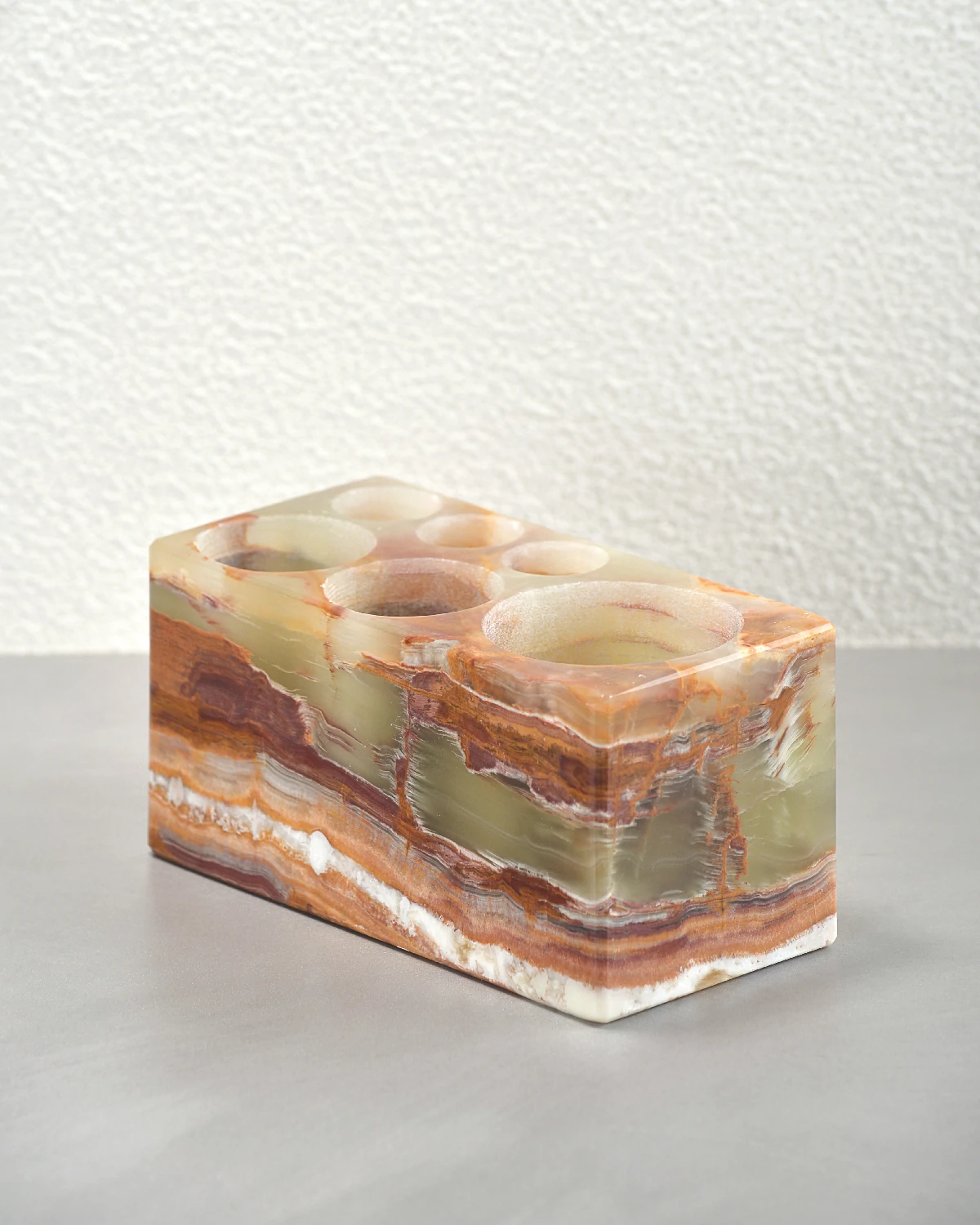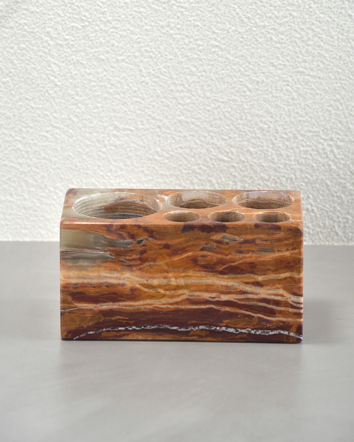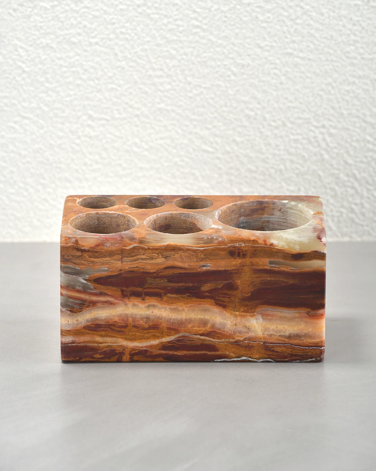 Crafted from natural onyx, this small yet elegant toothbrush holder features five perfectly aligned cutouts for organizing your bathroom essentials. The design is simple, allowing the stone’s unique color variations—from earthy reds and greens to translucent whites—to shine through, making each piece one-of-a-kind.