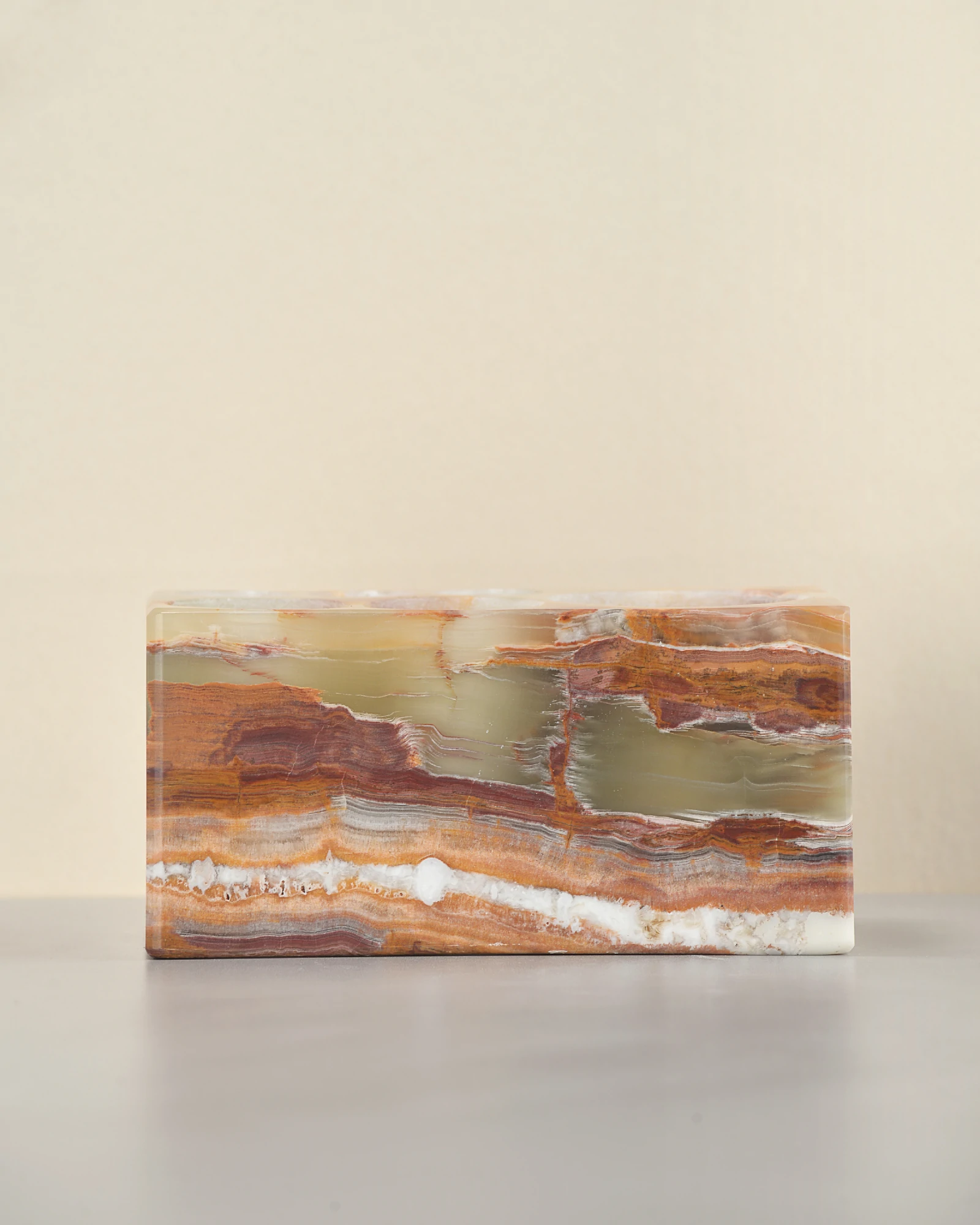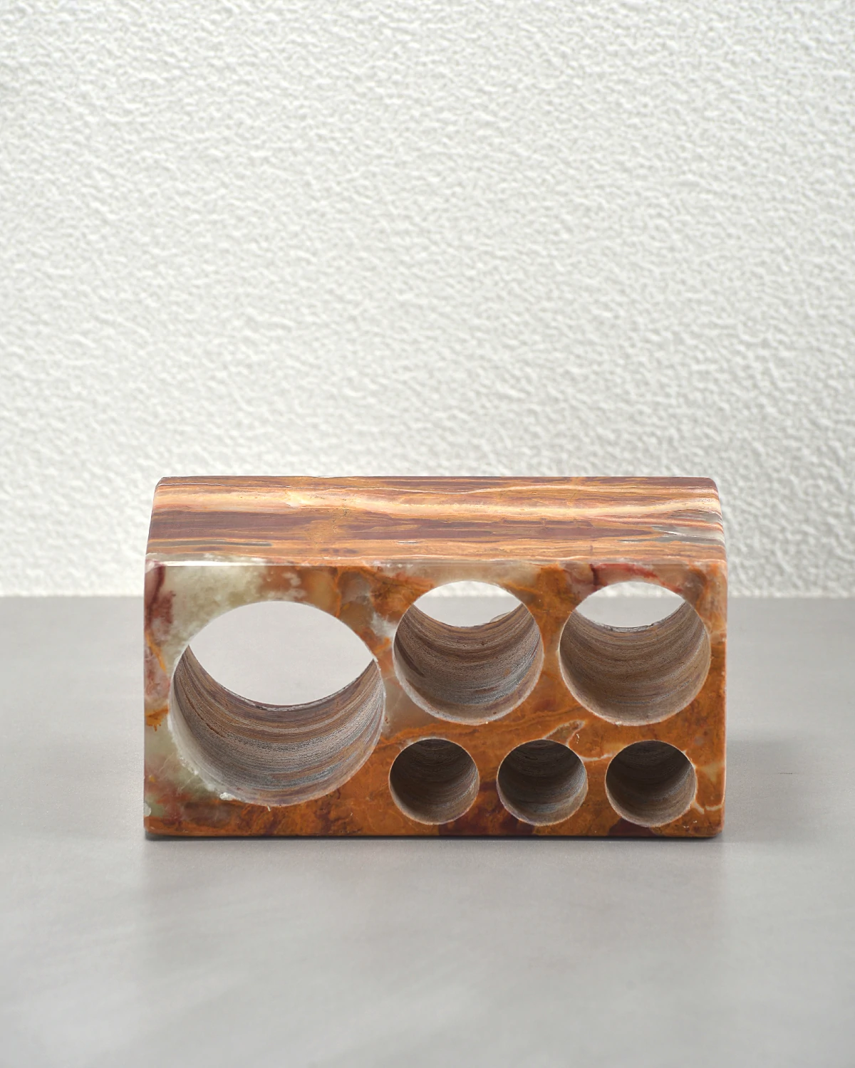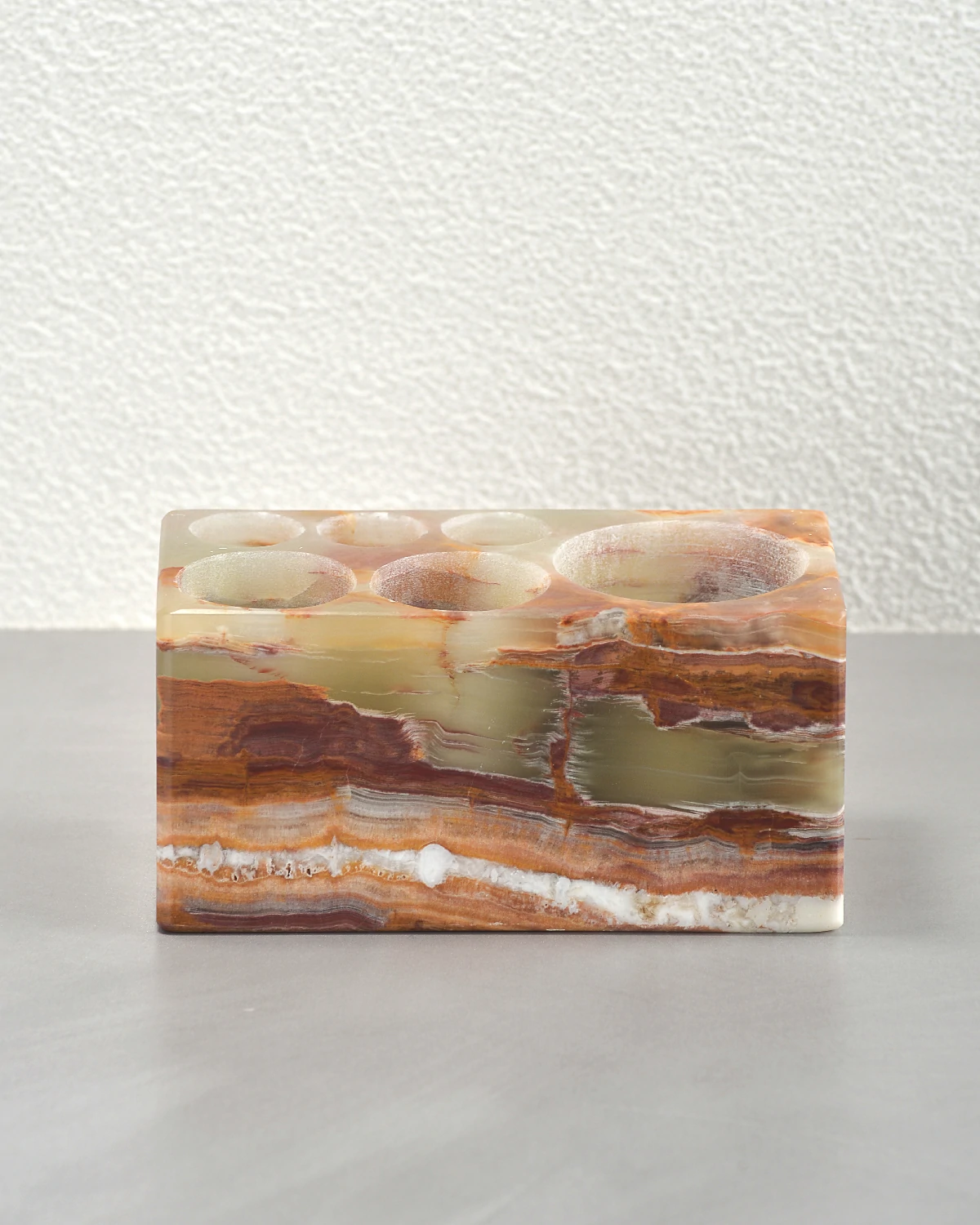 Crafted from natural onyx, this small yet elegant toothbrush holder features five perfectly aligned cutouts for organizing your bathroom essentials. The design is simple, allowing the stone’s unique color variations—from earthy reds and greens to translucent whites—to shine through, making each piece one-of-a-kind.