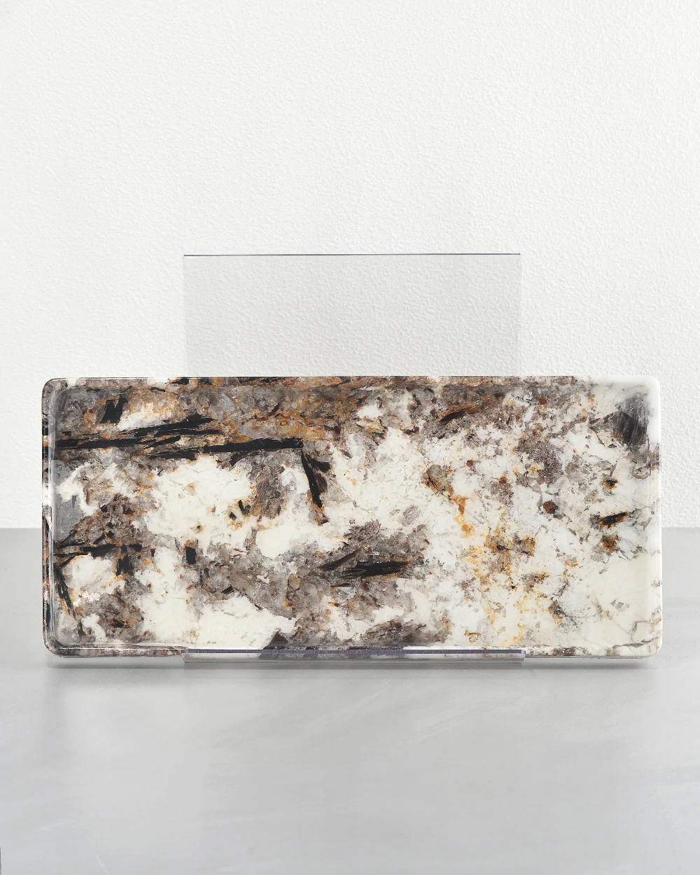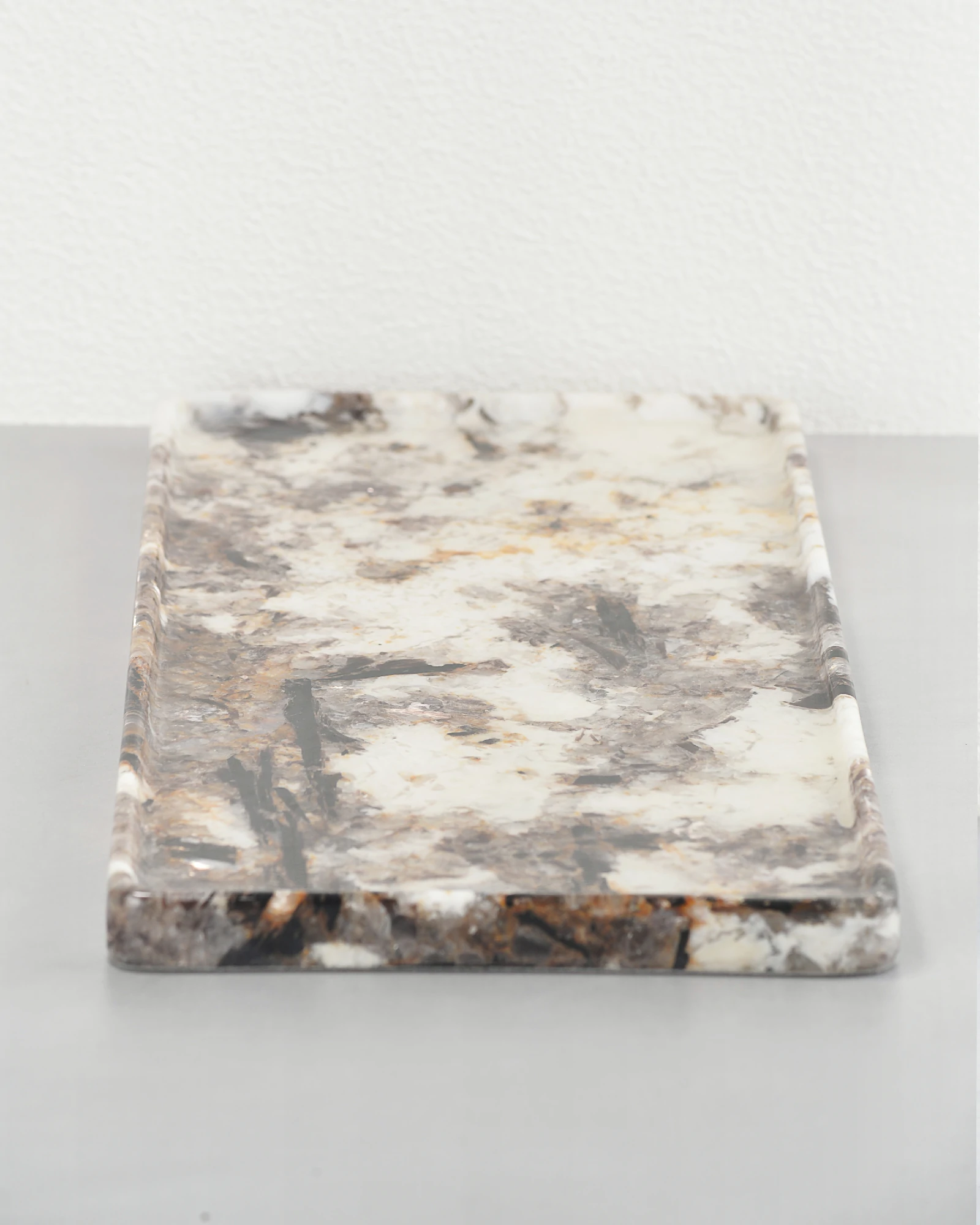 Handcrafted from the luxurious Patagonia Blanc Marble, this tray showcases a striking blend of natural veining and crystal-like textures that shimmer beneath a smooth, glossy finish. The refined rectangular silhouette (38×18cm) emphasizes clean lines and balance, making it both practical and visually stunning.